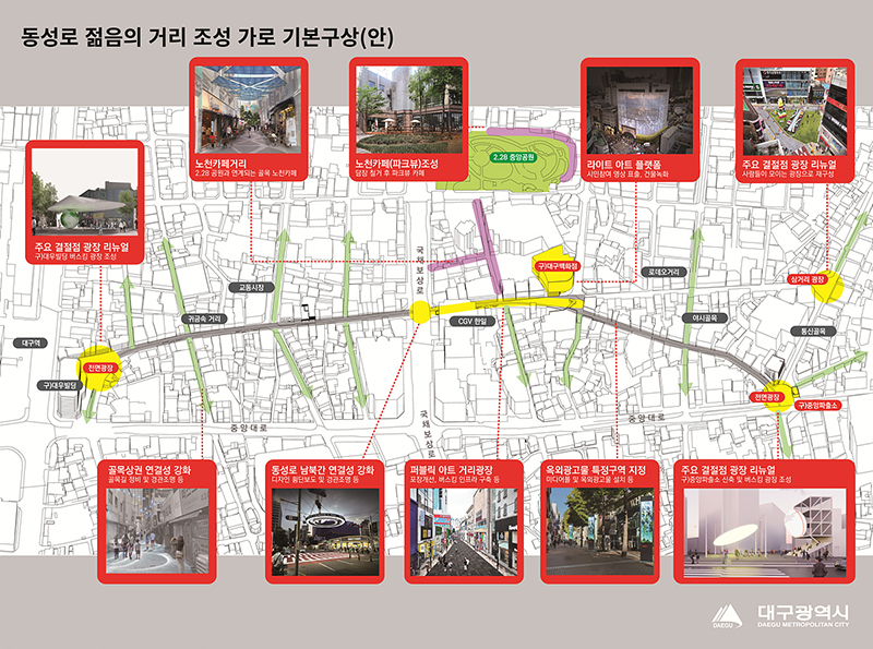 대구광역시는 대구 도심의 최대 번화가인 동성로의 옛 명성과 도심의 활력을 되찾기 위해 동성로 일대를 문화, 축제, 먹거리, 쇼핑 등 젊은이와 관광객이 마음껏 즐길 수 있는 젊고 활력이 넘치는 대구의 대표거리로 탈바꿈시킨다.