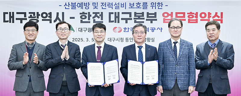 대구광역시와 한국전력공사 대구본부는 3월 5일(수) 오후 4시, 대구광역시 동인청사에서 ‘산불예방 및 전력설비 보호’를 위한 업무협약을 체결했다.