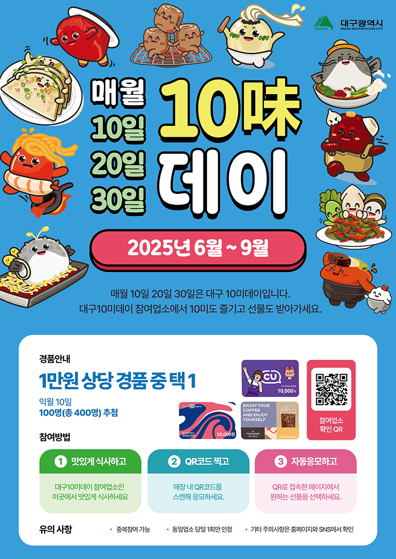 대구광역시는 올해로 지정 20년 차를 맞이하는 대구를 대표하는 향토 음식인 ‘대구10미’의 인지도 제고 및 지역 외식업계 활성화를 위해, 6월부터 9월까지 매월 10일·20일·30일을 ‘대구10미데이’로 지정하고 다양한 혜택과 이벤트를 운영한다.