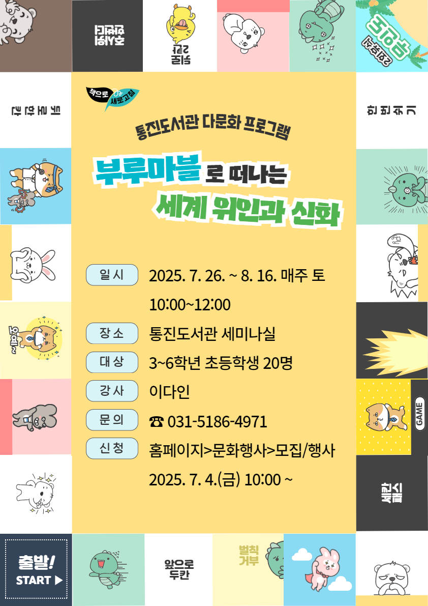 김포시(시장 김병수) 통진도서관은 다문화 프로그램 ‘부루마블로 떠나는 세계 위인과 신화’를 오는 7월 26일부터 8월 16일까지 매주 토요일 오전 10시에 통진도서관 세미나실에서 운영한다고 밝혔다.