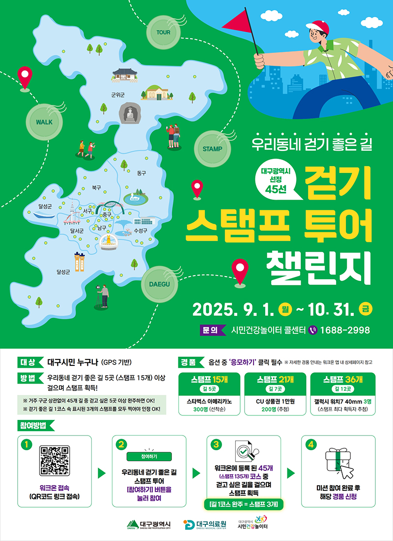 강연숙 대구광역시 건강증진과장은 “걷기 운동은 특별한 장비나 시설이 필요하지 않기 때문에 누구나 쉽게 시작할 수 있다”며, “이번 행사를 통해 시민들이 일상 속에서 자연스럽게 걷기 습관을 형성하고, 지역 곳곳의 걷기 좋은 길을 발견하는 계기가 되길 바란다”고 말했다.